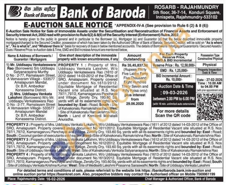 PROPERTY 1: Property of Mrs. Uddisapu Venkata Lakshmi, W/o Uddisapu Venkateswara Rao (1610 of 2012 dated 14-03-2012 of the Office of SRO,c. Property covered under document No.1610/2012. Equitable Mortgage of Residential Vacant site situated at R.S. Nos 797/1,797/2, Kamanagaruvu Panchayat and Village, Zeroity Dry, 193.60 Sq. yards with all its easements rights and bounded by: East: Road; South: Site of Kalvakonalu Ramakrishna Rao; West Site of Kalvakonalu Ramakrishna Rao; North Land of Karneedi Mahatalli Anuradha.