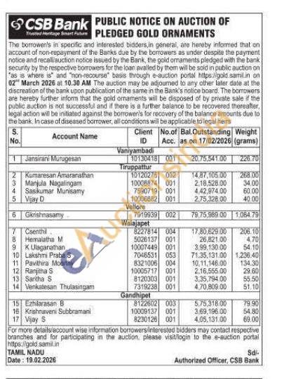 CSB Bank Gold Auctions Auction in Vellore