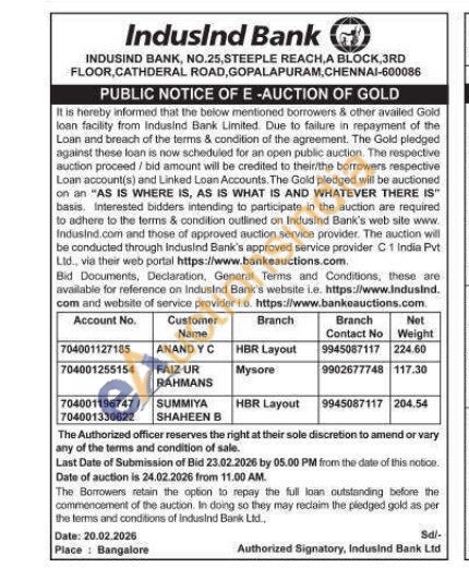 IndusInd Bank Gold Auctions Auction in Bengaluru