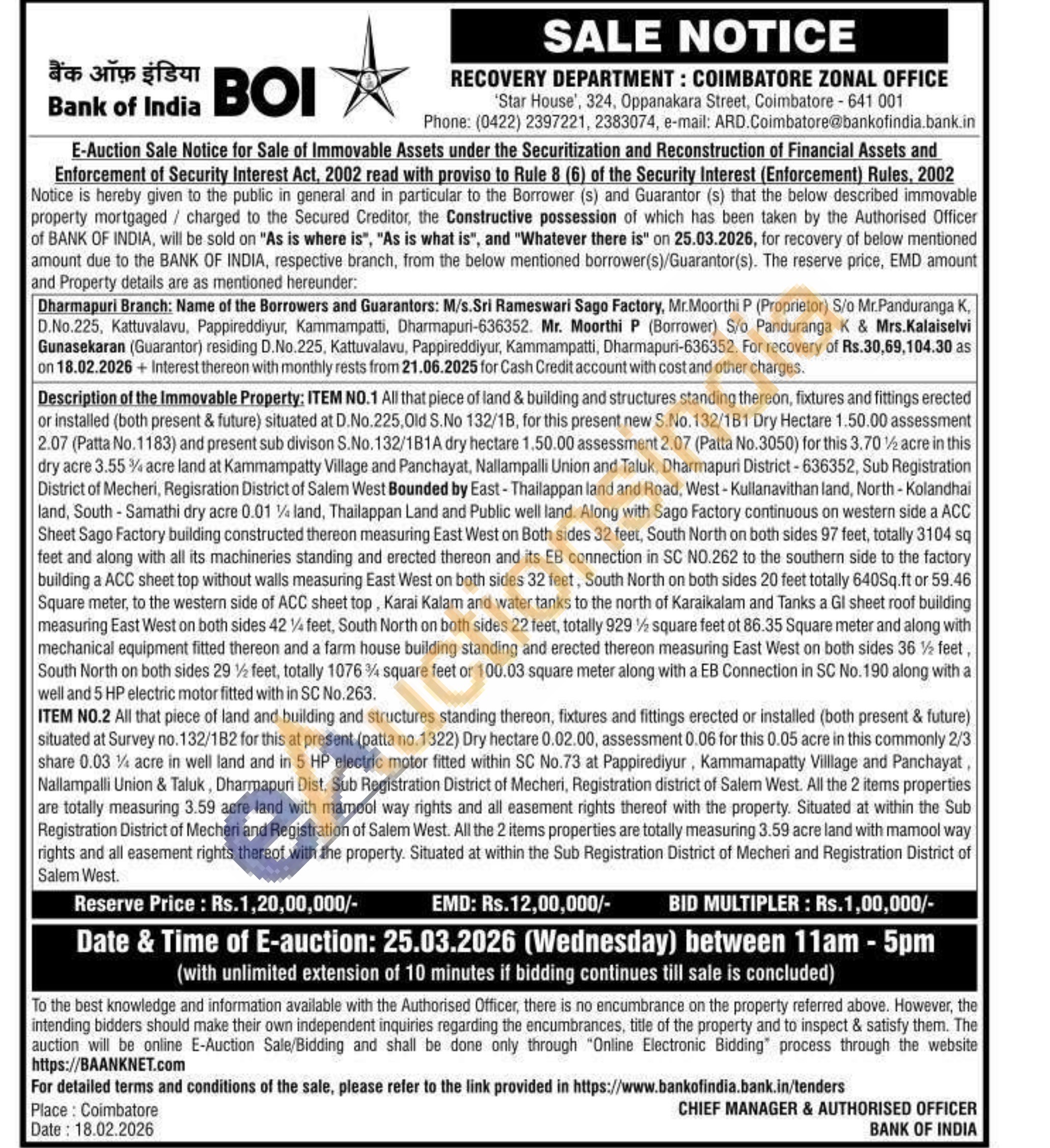 ITEM NO.1 All that piece of land & building and structures standing thereon, fixtures and fittings erected or installed (both present & future) situated at D.No.225, Old S.No 132/18, for this present new S.No. 132/1B1 Dry Hectare 1.50.00 assessment 2.07 (Patta No.1183) and present sub divison S.No. 132/1B1A dry hectare 1.50.00 assessment 2.07 (Patta No.3050) for this 3.701½ acre in this dry acre 3.55% acre land at Kammampatty Village and Panchayat, Nallampalli Union and Taluk, Dharmapuri District-636352, Sub Registration District of Mecheri, Regisration District of Salem West Bounded by East-Thailappan land and Road, West - Kullanavithan land, North - Kolandhai land, South-Samathi dry acre 0.01 % land, Thailappan Land and Public well land. Along with Sago Factory continuous on western side a ACC Sheet Sago Factory building constructed thereon measuring East West on Both sides 32 feet, South North on both sides 97 feet, totally 3104 sq feet and along with all its machineries standing and erected thereon and its EB connection in SC NO.262 to the southern side to the factory building a ACC sheet top without walls measuring East West on both sides 32 feet, South North on both sides 20 feet totally 640Sq.ft or 59.46 Square meter, to the western side of ACC sheet top, Karai Kalam and water tanks to the north of Karaikalam and Tanks a Gl sheet roof building measuring East West on both sides 42 14 feet, South North on both sides 22 feet, totally 929% square feet ot 86.35 Square meter and along with mechanical equipment fitted thereon and a farm house building standing and erected thereon measuring East West on both sides 36 ½ feet, South North on both sides 29% feet, totally 1076% square feet or 100.03 square meter along with a EB Connection in SC No.190 along with a well and 5 HP electric motor fitted with in SC No.263. ITEM NO.2 All that piece of land and building and structures standing thereon, fixtures and fittings erected or installed (both present & future) situated at Survey no. 132/182 for this at present (patta no. 1322) Dry hectare 0.02.00, assessment 0.06 for this 0.05 acre in this commonly 2/3 share 0.03% acre in well land and in 5 HP electric motor fitted within SC No.73 at Pappirediyur, Kammamapatty Village and Panchayat, Nallampalli Union & Taluk, Dharmapuri Dist, Sub Registration District of Mecheri, Registration district of Salem West. All the 2 items properties are totally measuring 3.59 acre land with mamool way rights and all easement rights thereof with the property. Situated at within the Sub Registration District of Mecheri and Registration of Salem West. All the 2 items properties are totally measuring 3.59 acre land with mamool way rights and all easement rights thereof with the property. Situated at within the Sub Registration District of Mecheri and Registration District of Salem West.