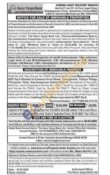 All that part and parcel of land and building bearing Old survey No. 1348/1(part) Patta No.340, New Survey No. 1594/8 (Gramanatham) Land Measuring about 8927 Sq.ft Situated at Eswaran Kovil Street, Chenganmal, Thaiyur Village, Thiruporur Taluk, Kancheepuram District-603103, Boundaries of the party: North by: Land Comprised in Survey No: 1594/7, South by: Survey No. 1594/10 and Survey No. 1594/5, East by: Survey No. 1594/11, West by: Road, Linear measurements of the land: The land admeasures East to West 33 meters on the North and 30 meters on the South, North to South 25.8 meters on the East, 26.2 meters on the West, totalling 819 Sq. Meters equivalent to 8927 Sq.ft.