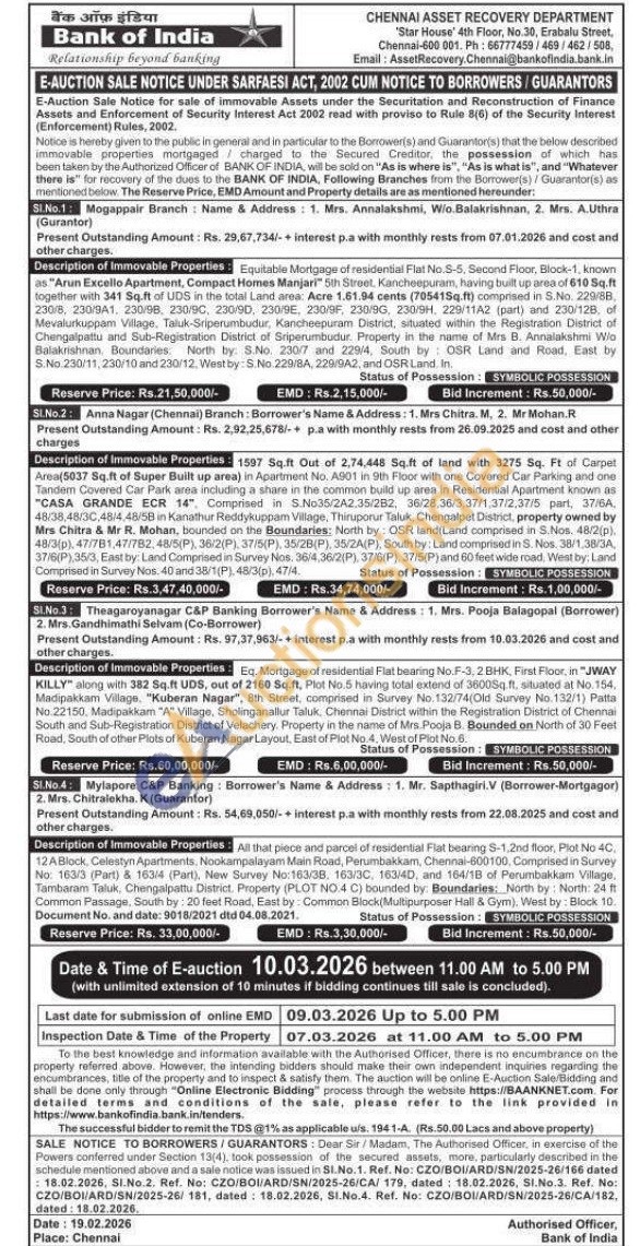 4) All that piece and parcel of residential Flat bearing S-1.2nd floor, Plot No 4C 12A Block, Celestyn Apartments, Nookampalayam Main Road, Perumbakkam, Chennai-600100, Comprised in Survey No: 163/3 (Part) & 163/4 (Part), New Survey No: 163/38, 163/30, 163/40, and 164/18 of Perumbakkam Village, Tambaram Taluk, Chengalpattu District. Property (PLOT NO.4 C) bounded by Boundaries: North by: North: 24 ft Common Passage, South by: 20 feet Road, East by: Common Block Multipurposer Hall & Gym), West by: Block 10. Document No. and date: 9018/2021 dtd 04.08.2021
