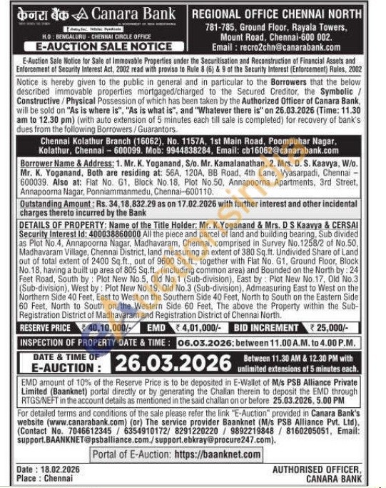 All the piece and parcel of land and building bearing, Sub divided as Plot No.4, Annapoorna Nagar, Madhavaram, Chennai, comprised in Survey No. 1258/2 of No.50, Madhavaram Village, Chennai District, land measuring an extent of 380 Sq.ft. Undivided Share of Land out of total extent of 2400 Sq.ft., out of 9600 Sq.ft., together with Flat No. G1, Ground Floor, Block No.18, having a built up area of 805 Sq.ft., (including common area) and Bounded on the North by: 24 Feet Road, South by: Plot New No.5. Old No.1 (Sub-division), East by: Plot New No. 17. Old No.3 (Sub-division), West by: Plot New No. 19. Old No.3 (Sub-division), Admeasuring East to West on the Northern Side 40 Feet, East to West on the Southern Side 40 Feet, North to South on the Eastern Side 60 Feet, North to South on the Western Side 60 Feet, The above the Property within the Sub-Registration District of Madhavaram and Registration District of Chennai North
