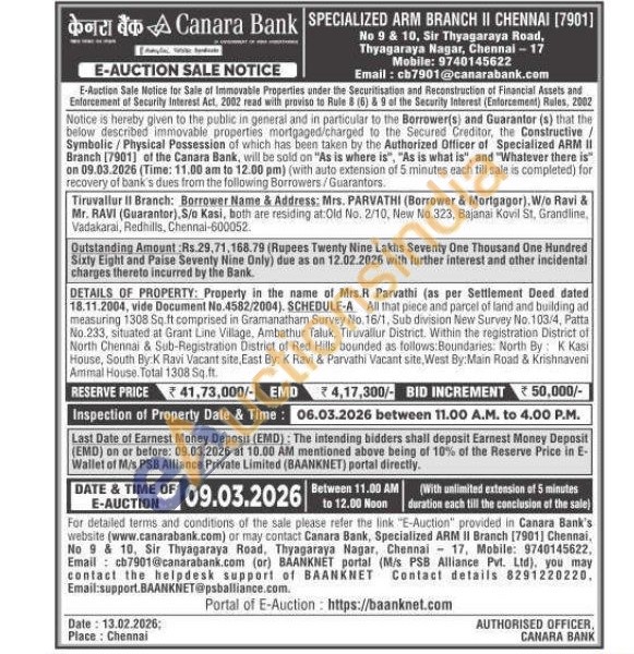 All that piece and parcel of land and building ad measuring 1308 Sq.ft comprised in Gramanatham Survey No. 16/1, Sub division New Survey No. 103/4, Patta No.233, situated at Grant Line Village, Ambathur Taluk, Tiruvallur District. Within the registration District of North Chennai & Sub-Registration District of Red Hills bounded as follows: Boundaries: North By: K Kasi House, South By:K Ravi Vacant site, East By: K Ravi & Parvathi Vacant site, West By:Main Road & Krishnaveni Ammal House. Total 1308 Sq.ft.