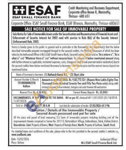 All the piece and purcel of adming 3.5 Conts of immovable property induding building and all the improvemesth therein comprised in Survey No. 397/13, Kattakkare Villege, Kottarakkara, kalok, Kollam Unnict Boundaries: East Property of Beers, West. Property of Modrija Beev, North. Popety of Sudheer, South: Ruod