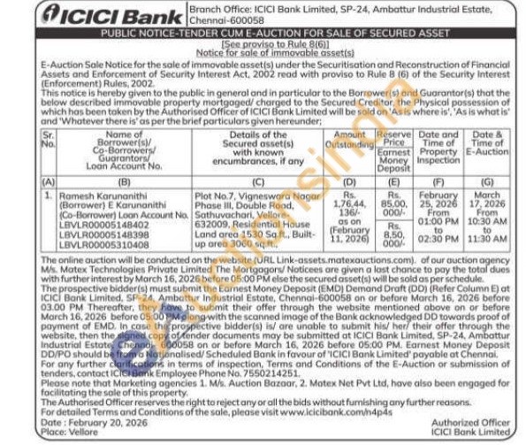 Plot No. 7. Vigneswara Nagar Phase Ill, Double Rood, Sathuvachari, Vellore- 632009, Residential House Land area 1530 Sq.ft., Built-up area 3060 sq.ft. Sathuvachari, Vellore-
