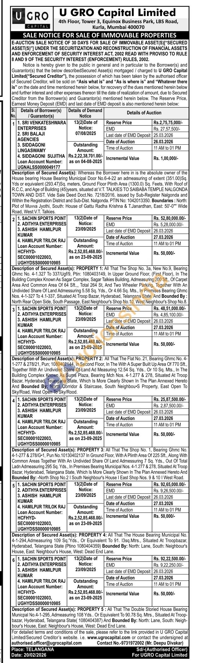 Description of Secured Asset(s): Whereas the Borrower here in is the absolute owner of the House bearing House Bearing Municipal Door No.6-4-22 an admeasuring of extent (351.00)Sq. Yds or equivalent (293.47)Sq. meters, Ground Floor Plinth Area (1300.0) Sq. Feets, With Roof of R.C.C, and Age of Building (45)years, situated at V.T. TALKIES TO SAIBABA TEMPLE NALGONDA TOWN AND DIST. Vide Sale Deed Doct.No. 7218/2016, issued by Sub-Register Nalgonda and Within the Registration District and Sub-Dist. Nalgonda. PTIN No: 1042013350. Boundaries: North: Plot of Muvva Jyothi, South: House of Gattu Radha Krishna & T.Janardhan, East: 50'-0"" Wide Road, West:V.T. Talkies