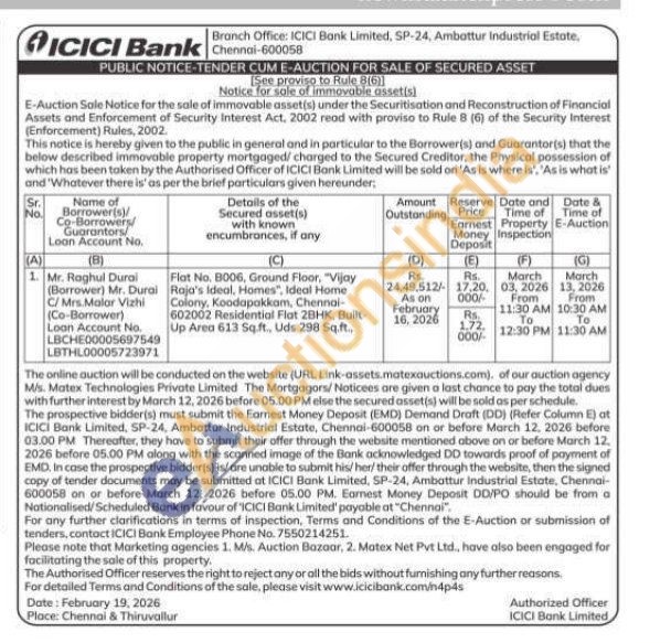 Flat No. B006, Ground Floor, "Vijay Raja's Ideal, Homes", Ideal Home Colony, Koodapakkam, Chennai-602002 Residential Flat 2BHK, Built-Up Area 613 Sq.ft., Uds 298 Sq.ft.,