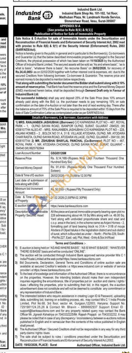 All the piece and parcel immovable property bearing open plot no 228 admeasuring about 44.18 50 Mrs along with te. 4800 Sq Yard along with undivided proportionate share and road and cop.area in the land, in the scheme name as Anjani Homes-2. formating part of land bearing block no 31/A 31/8 of moge Atodara of Olpad taluka in the registration district and sub district of surat, which is Bounded as under-Noth Plot No 229, South -Plot No 227, East ad Plot West-Entry & Soc int Road