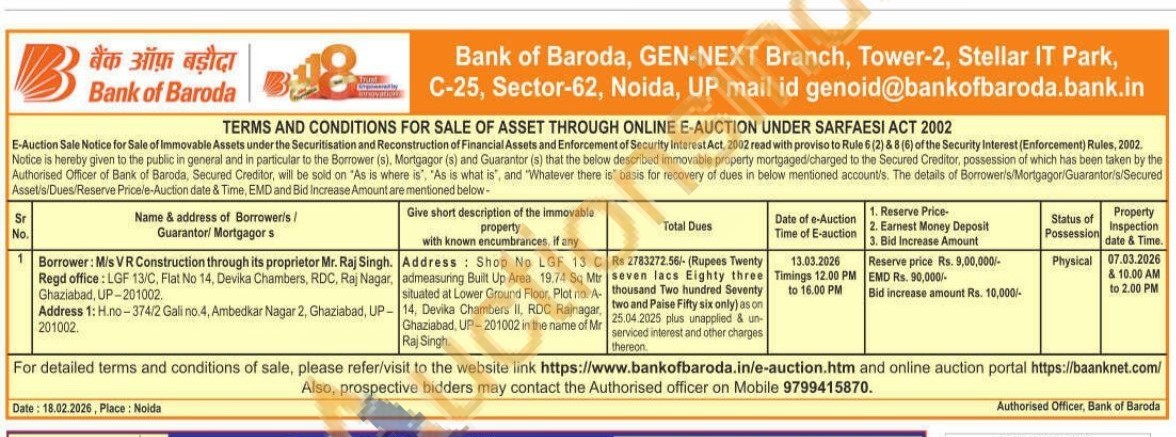 Address: Shop No LGF 13 C admeasuring Built Up Area 19.74 Sq Mtr situated at Lower Ground Floor, Plot no. A 14, Devika Chambers II. RDC Rajnagar, Ghaziabad, UP-201002 in the name of Mr Raj Singh.