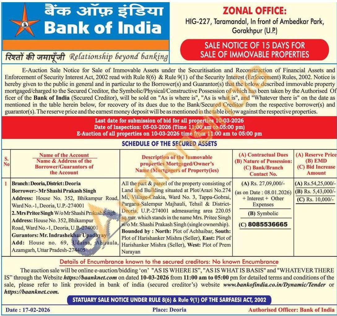 All the part & parcel of the property consisting of Land and Building situated at Plot/Arazi No.274 Mi, Village-Chakia, Ward No. 3, Tappa-Gobrai, Pargana-Salempur Majhauli, Tehsil & District-Deoria, U.P.-274001 admeasuring area 220.05 sq.mtr. which stands in the name Mrs. Pritee Singh w/o Mr. Shashi Prakash Singh (single ownership). ( Bounded by: North: Plot of Achhaibar, South: Plot of Harishanker Mishra (Seller), East: Plot of Harishanker Mishra (Seller), West: Plot of Prem Narayan