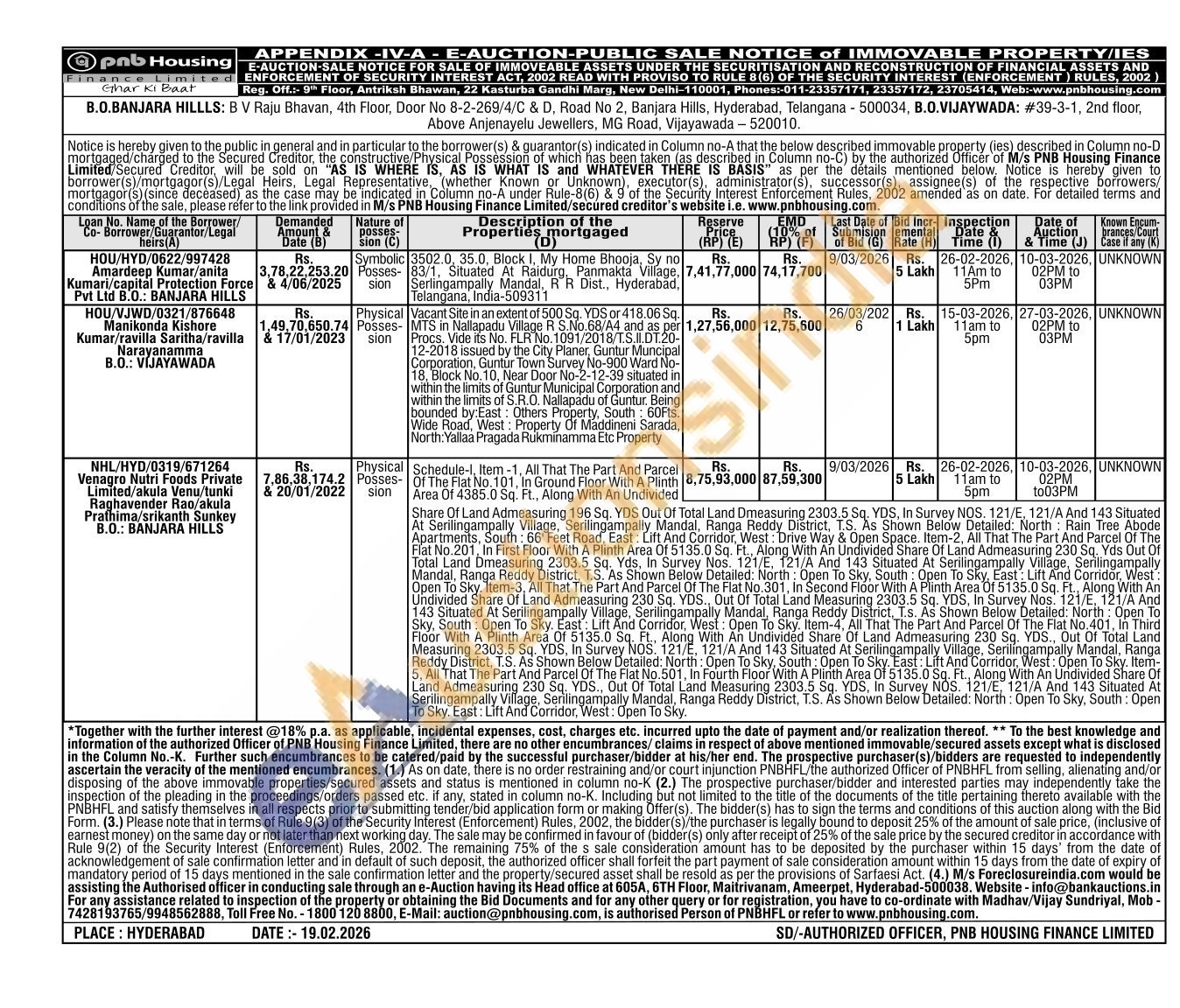 Schedule-I, Item-1, All That The Part And Parcel Of Of The Flat No. 101, In Ground Floor With A Plinth Area Of 4385.0 Sq. Ft., Along With An Undivided Share Of Land Admeasuring 196 Sq. YDS Out Of Total Land Dmeasuring 2303.5 Sq. YDS, In Survey NOS. 121/E, 121/A And 143 Situated At Serilingampally Village, Serilingampally Mandal, Ranga Reddy District, T.S. As Shown Below Detailed: North: Rain Tree Abode Apartments, South: 66' Feet Road, East: Lift And Corridor, West: Drive Way & Open Space. Item-2, All That The Part And Parcel Of The Flat No.201, In First Floor With A Plinth Area Of 5135.0 Sq. Ft., Along With An Undivided Share Of Land Admeasuring 230 Sq. Yds Out Of Total Land Dmeasuring 2303.5 Sq. Yds, In Survey Nos. 121/E, 121/A And 143 Situated At Serilingampaily Village, Serilingampally Mandal, Ranga Reddy District, T.S. As Shown Below Detailed: North: Open To Sky, South: Open To Sky, East: Lift And Corridor, West: Open To Sky. Item-3, All That The Part And Parcel Of The Flat No.301, In Second Floor With A Plinth Area Of 5135.0 Sq. Ft., Along With An Undivided Share Of Land Admeasuring 230 Sq. YDS., Out Of Total Land Measuring 2303.5 Sq. YDS, In Survey Nos. 121/E, 121/A And 143 Situated At Serilingampally Village, Serilingampally Mandal, Ranga Reddy District, T.s. As Shown Below Detailed: North: Open To Sky, South: Open To Sky. East: Lift And Corridor, West: Open To Sky. Item-4, All That The Part And Parcel Of The Flat No.401, In Third Floor With A Plinth Area Of 5135.0 Sq. Ft., Along With An Undivided Share Of Land Admeasuring 230 Sq. YDS., Out Of Total Land Measuring 2303.5 Sq. YDS, In Survey NOS. 121/E, 121/A And 143 Situated At Serilingampally Village, Serilingampally Mandal, Ranga Reddy District, T.S. As Shown Below Detailed: North: Open To Sky, South: Open To Sky. East: Lift And Corridor, West: Open To Sky. Item-5. All That The Part And Parcel Of The Flat No.501, In Fourth Floor With A Plinth Area Of 5135.0 Sq. Ft., Along With An Undivided Share Of Land Admeasuring 230 Sq. YDS., Out Of Total Land Measuring 2303.5 Sq. YDS, In Survey NOS. 121/E, 121/A And 143 Situated At Serilingampally Village, Serilingampally Mandal, Ranga Reddy District, T.S. As Shown Below Detailed: North: Open To Sky, South: Open To Sky. East: Lift And Corridor, West: Open To Sky.