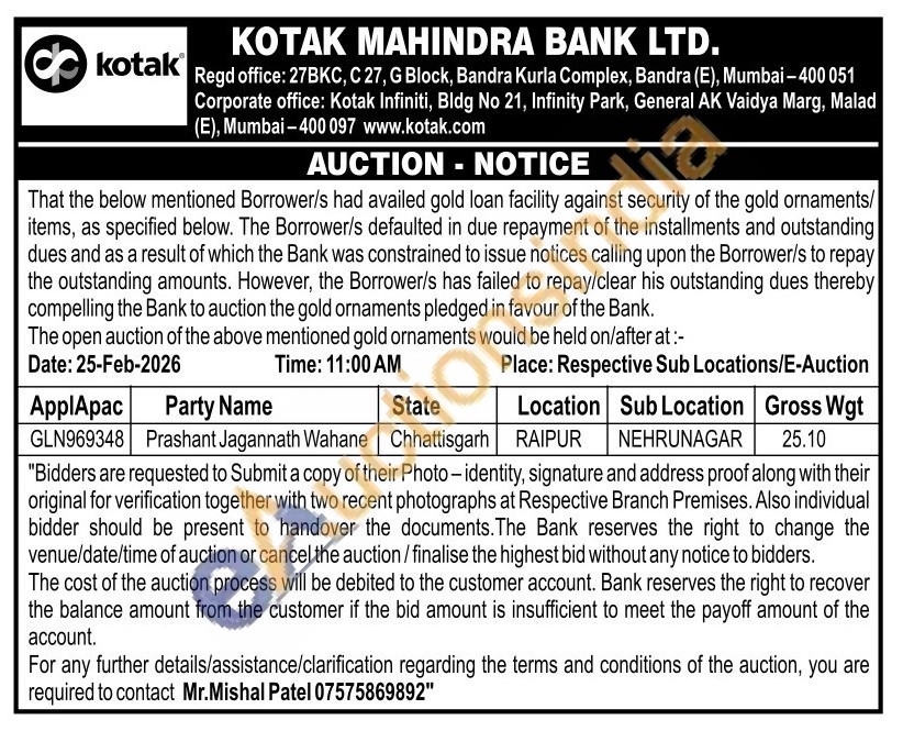 Kotak Mahindra Bank Gold Auctions Auction in Raipur