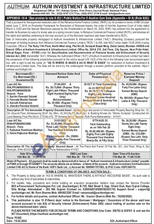 Description Of The Immovable Property/Secured Asset: All that piece and parcel of Immovable Property Bearing Shop No. 10. On Ground Floor, Admeasuring 30.67 Sq. Mtrs. I.E.330 Sq. Ft. (Built Up), In Building Known As "Shrinecomplex Land Bearing Final Plot No-5, CTS No.415, TP Scheme No- II, Somwar Peth Pune Maharashtra-411011