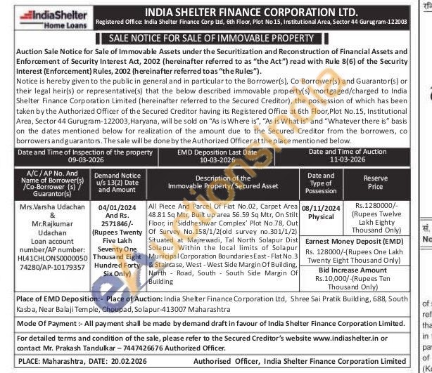 All Piece And Parcel Of Flat No.02, Carpet Area 48.81 Sq Mtr, Built up area 56.59 Sq Mtr, On Stilt Floor, in 'Siddheshwar Complex' Plot No.78, Out Of Survey No.158/1/2(old survey no.301/1/2) Situated at Majrewadi, Tal North Solapur Dist Solapur Within the local limits of Solapur Municipal Corporation Boundaries East-Flat No.3 & Staircase, West-West Side Margin Of Building, North Road, South South Side Margin Of Building