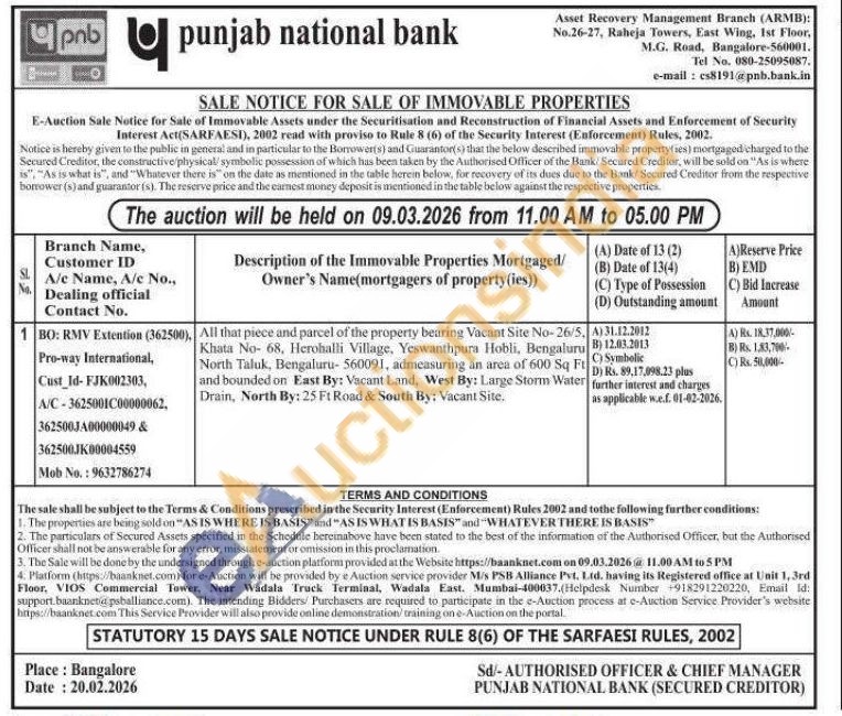 All that piece and parcel of the property bearing Vacant Site No-26/5, Khata No- 68, Herohalli Village, Yeswanthpura Hobli, Bengaluru North Taluk, Bengaluru-560091, admeasuring an area of 600 Sq Ft and bounded on East By: Vacant Land, West By: Large Storm Water Drain, North By: 25 Ft Road & South By: Vacant Site