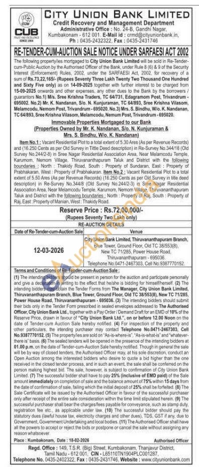 Vacant Residential Plot to a total extent of 5.30 Ares (As per Revenue Records) and (16.250 Cents as per Old Survey in Tittle Deed description) in Re-Survey No.344/18 (Old Survey No.244/2-8) in Sree Nagar Residential Association Area, Near Melamcodu Temple, Karumom, Nemom Village, Thiruvananthapuram Taluk and District with the following boundaries: North Thakidy Road, South Property of Sundaran, East: Property of Prabhakaran, West Property of Prabhakaran. Item No.2: Vacant Residential Plot to a total extent of 5,50 Ares (As per Revenue Records) (16.250 Cents as per Old Survey in title deed description) in Re-Survey No.344/8 (Old Survey No.244/2-3) in Sree Nagar Residertal Association Area, Near Melamcodu Temple. Karumom, Nemom Village, Thiruvananthapuram Taluk and District with the following boundaries, North Property of Raj, South Property of Raj, East: Property of Manian, West: Thakidy Road.