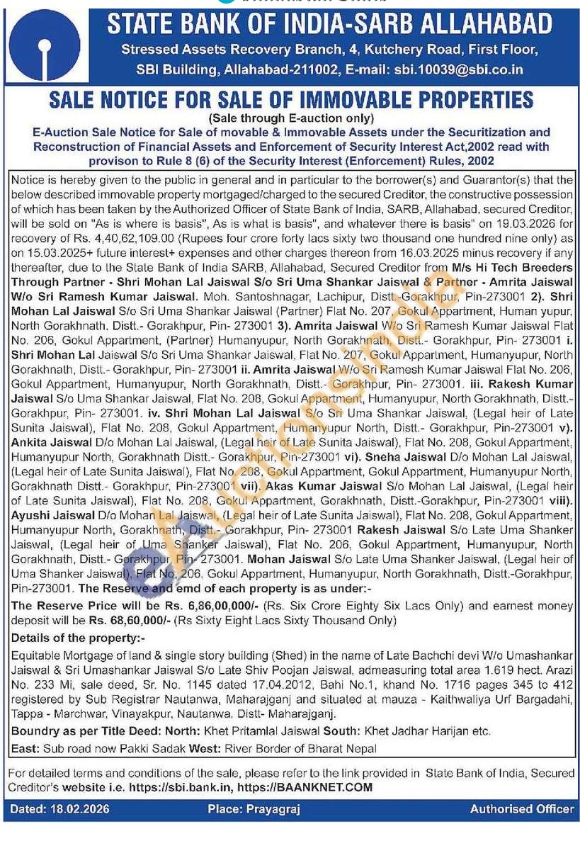 Equitable Mortgage of land & single story building (Shed) in the name of Late Bachchi devi W/o Umashankar Jaiswal & Sri Umashankar Jaiswal S/o Late Shiv Poojan Jaiswal, admeasuring total area 1.619 hect. Arazi No. 233 Mi, sale deed, Sr. No. 1145 dated 17.04.2012, Bahi No.1, khand No. 1716 pages 345 to 412 registered by Sub Registrar Nautanwa, Maharajganj and situated at mauza Kaithwaliya Urf Bargadahi, Tappa - Marchwar, Vinayakpur, Nautanwa. Distt- Maharajganj