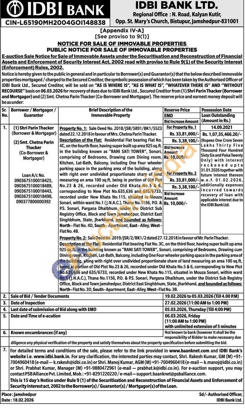 Sale Deed No. 2019/JSR/2/BK1/2dated 27.12.2018 in favour of Mr. Parin Thacker. Description of the Flat: Residential Flat bearing Flat No. 3C, on the third floor, having super built up area 925 sq.ft. in the building known as "RANI SATI TOWER", Sonari, comprising of Bedrooms, Drawing cum Dining room, Kitchen, Lat-Bath, Balcony, including One Four wheeler parking space in the parking area of the building, along with right over undivided proportionate share of land measuring an area 100 sq.ft. being in portion of Old Plot No.23 & 26, recorded under Old Khata No.5 & 6, corresponding to New Plot No.635,636 and 635/6733, recorded under New Khata No.115, situated in Mouza Sonari, within ward No.1 (J.N.A.C.), Thana No.1156, P.O. & P.S. Sonari, Pargana Dhalbhum, under the District Sub Registry Office, Block and Town Jamshedpur, District East Singhbhum, State, Jharkhand, and bounded as follows: North-Flat No. 3D, South-Apartment, East-Alley, West-Flat No. 38