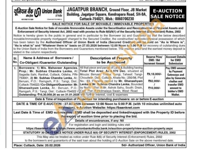 All that piece and parcel of Land & Building having Total Plot Area: Ac.0.070 Dec. situated at Mouza: Beruan, Thana: Tangi, Tahasil: Tangi-Choudwar, Dist.: Cuttack, Khata No.: 250/56, Plot No.: 63, Property owned by Mr. Ghanashyam Lenka & Mr. Subhas Chandra Lenka, Bounded by North: Plot of Mr. Ashok Sahu, South: Drain, East: Plot of Padmalaya Swain, West: Road