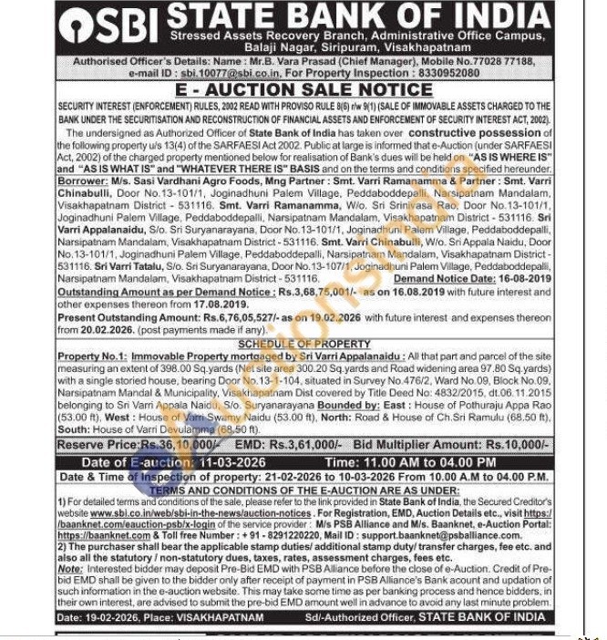 Property No.1: Immovable Property mortgaged by Sri Varri Appalanaidu: All that part and parcel of the site measuring an extent of 398.00 Sq.yards (Net site area 300.20 Sq.yards and Road widening area 97.80 Sq.yards) with a single storied house, bearing Door No. 13-1-104, situated in Survey No.476/2, Ward No.09, Block No.09. Narsipatnam Mandal & Municipality, Visakhapatnam Dist covered by Title Deed No: 4832/2015, dt.06.11.2015 belonging to Sri Varri Appala Naidu, S/o. Suryanarayana Bounded by: East: House of Pothuraju Appa Rao (53.00 ft), West: House of Varri Swamy Naidu (53.00 ft), North: Road & House of Ch. Sri Ramulu (68.50 ft), South: House of Varri Devulamma (68.50 ft).