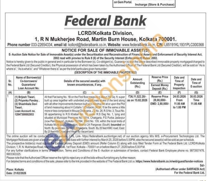 All that Flat being No. 18 on the First floor measuring about 750 Sq. ft. super built up area together with undivided proportionate share of the land along with all other improvements thereon built and constructed at or upon the Plot of land measuring about 4 Cottahs 1 Chittacks 34 Sq. it be the same a little more or less comprised in Mouza Chakgaria, J.L.No. 26, R.S No. 3, Touzi No. 56 appertaining to R.S Khatian No. 10, under R.S Dag No. 1, lying and situated at Municipal Premises No. 1914, Chakgaria, PS Purba Jadavpur (now Panchsayar), Kolkata 700094, Ward No. 109, within the local limits of Kolkata Municipal Corporation, District 24 Parganas (South) bounded on North: By premises no. 1913, Chakgaria, South: By 20 feet KMC road, East: By 20 feet KMC road and West: By Vacant land