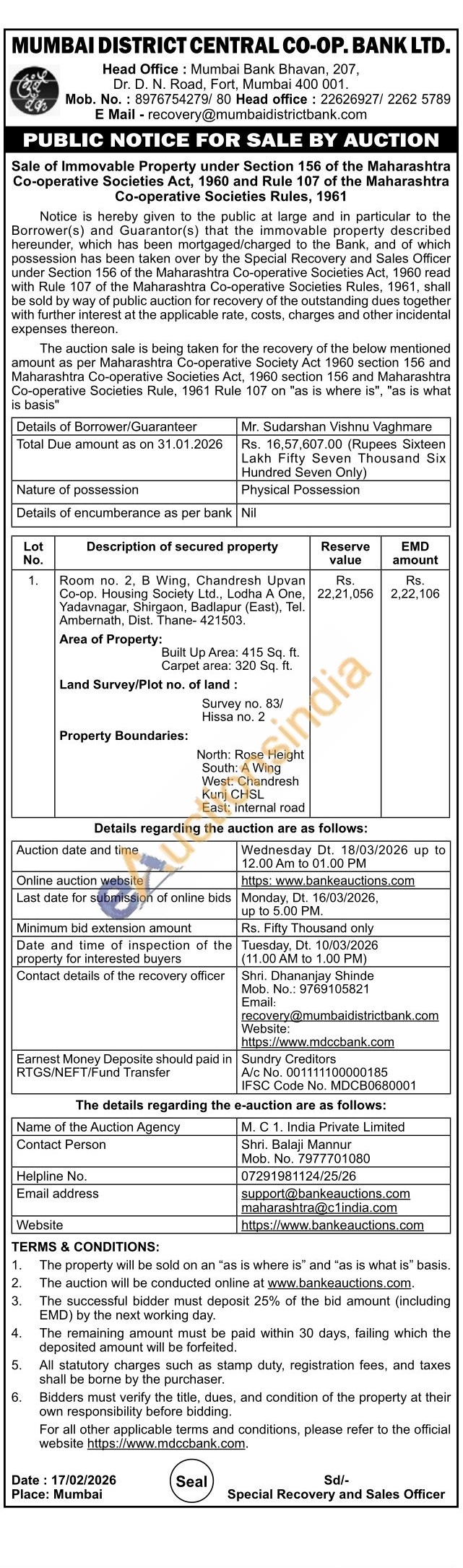 Room no. 2. B Wing, Chandresh Upvan Co-op. Housing Society Ltd., Lodha A One. Yadavnagar, Shirgaon, Badlapur (East). Tel Ambernath. Dist. Thane-421503. Area of Property: Built Up Area: 415 Sq. ft. Carpet area: 320 Sq. ft. Land Survey/Plot no. of land: Survey no. 83/ Hissa no. 2 Property Boundaries: North: Rose Height South: A Wing West: Chandresh Kunj CHSL East: internal road