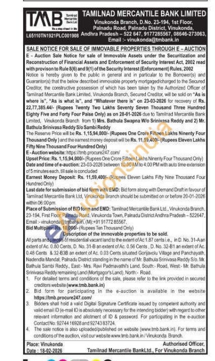 All parts and parcels of residential vacant land to the extent of Ac 1.87 centsie, in D. No. 31-Aan extent of Ac: 0.80 Cents, D. No. 31-8 an extent of Ac. 0.56 Cents, D. No. 32-81 an extent of Ac. 0:48 Cents &32-838 an extent of Ac, 0.03 Cents situated Gorjavolu Village and Panchayath, Nadendla Mandal, Palnadu District standing in the name of Mr. Bathula Srinivasa Reddy Sio. Mr. Bathula Sambi Reddy, East-Mrs. Ravi Padmavath's Land, South: Road, West- Mr. Bathula Srinivasa Reddy remaining Land (Mortgagor's Land), North Road.