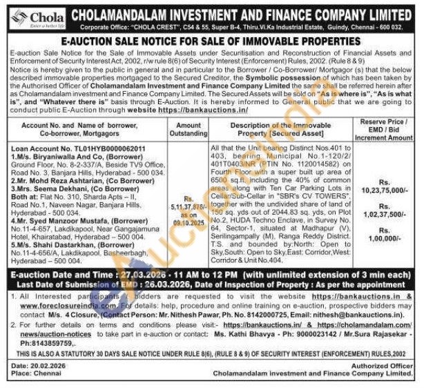 All that the Unit bearing Distinct Nos 401 to 403, bearing Municipal No.1-120/2/401T0403/NR (PTIN No. 1120014582) on Fourth Floor with a super built up area of 6500 sq.ft, including the 40% of common. areas along with Ten Car Parking Lots in Cellar/Sub-Cellar in "SBR's CV TOWERS" together with the undivided share of land of 150 sq. yds out of 2044.83 sq, yds, on Plot No.2. HUDA Techno Enclave, in Survey No. 64, Sector-1, situated at Madhapur (V), Serilingampally (M), Ranga Reddy District. T.S. and bounded by: North: Open to Sky, South: Open to Sky. East: Corridor, West: Corridor & Unit No. 404.