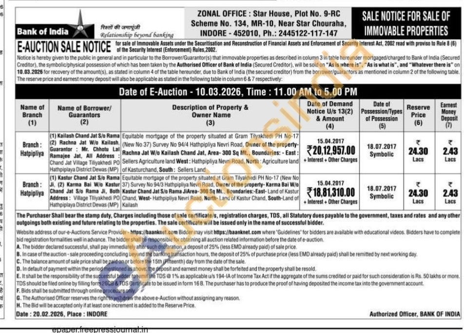 Equitable mortgage of the property situated at Gram Tilyakhedi PH No-17 (New No 37) Survey No 94/3 Hathpipliya Nevri Road, Owner of the property-Karma Bai W/o Kastur Chand Jat S/s Rama JiArea- 300 Sq Mt., Boundaries:-East-Land of Kastur PO Chand, West-Hathpipliya Nevri Road, North-Land of Kastur Chand, South-Land of Kailash