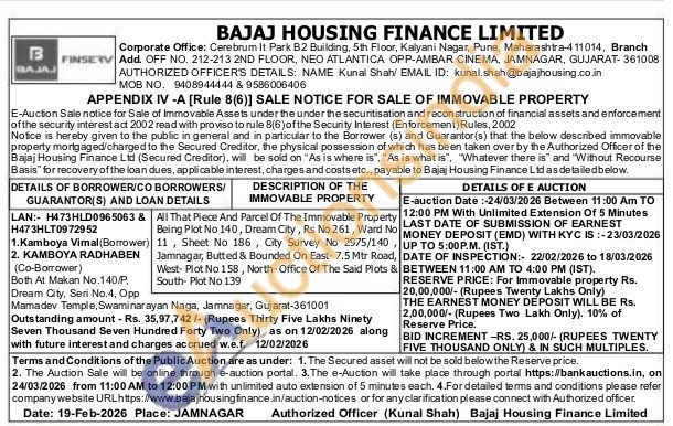 All That Piece And Parcel Of The Immovable Property Being Plot No 140, Dream City, Rs No 261, Ward No 11, Sheet No 186, City Survey No 2975/140, Jamnagar, Butted & Bounded On East- 7.5 Mtr Road, West- Plot No 158, North-Office Of The Said Plots & South Plot No 139