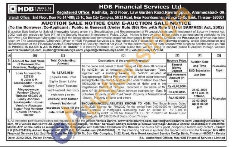 All the piece and parcel of land having of 4.05 Ares (10 cents) in Sy no:423/1 as of Amballur Village, Mukundapuram Taluk. together with a building bearing No: V/365C situated at Alagappanagar Grama Panchayth and all other appurtenances and rights thereto more fully described under Partition Deed No-1502/2006 in Sub Registration District of Nellai and in the Registration District of Thrissur recorded in the name of Mr. John AP Johnson and Fancy Johnson bounded by: East: B Schedule Property, North Road, West. Property of Manjali David South. Property of John and others