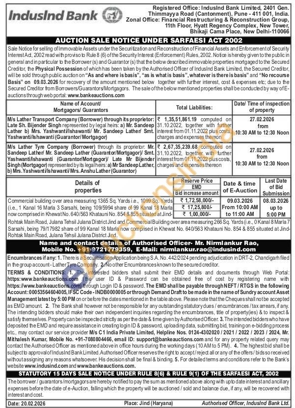 Commercial building over area measuring 1365 Sq. Yards i.e., 1099 Sq. Yards (i.e., 1 Kanal 16 Maria 3 Sarsahi, being 109/5994 share of 99 Kanal 18 Maria now comprised in Khewat No. 640/563 Khatauni No. 854 & 855 situated at Jind- Rohtak Main Road, Julana Tehsil Julana District Jind and Commercial Building over are a measuring 266 Sq. Yards (i.e., 0 Kanal 8 Maria 7 Sarsahi, being 79/17982 share of 99 Kanal 18 Marla now comprised in Khewat No. 640/563 Khatauni No. 854 & 855 situated at Jind Rohtak Main Road, Julana Tehsil Julana District Jind