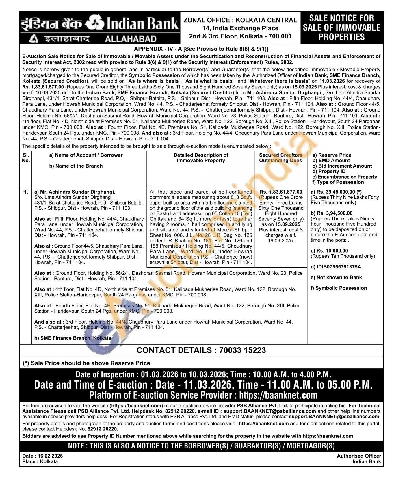 All that piece and parcel of self-contained commercial space measuring about 813 Sq.ft. super built up area with marble flooring situated on the ground floor of the said building (standing on Bastu Land admeasuring 05 Cottah 10 (Ten) Chittak and 34 Sq.ft. more or less) together having 2 rooms, 1 hall comprised in and lying and situated and situated at Mouza-Shibpur Sheet No. 008, J.L. No. 28 L.R. Dag No. 126 under L.R. Khatian No. 181, Plot No. 126 and 188 Premises / Holding No. 44/5, Choudhury Para Lane, Ward No. 044, under Howrah Municipal Corporation P.S. Chatterjee (now) erstwhile Shibpur, Dist - Howrah, Pin-711 104.