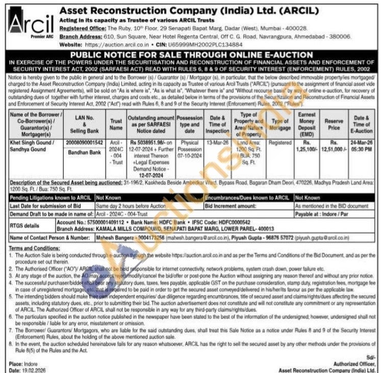 Description of the Secured Asset being auctioned: 31-196/2, Kaskheda Beside Ambedkar Ward, Bypass Road, Bagaran Dham Deori, 470226, Madhya Pradesh Land Area: 1200 Sq. Ft./Bua: 750 Sq. Ft