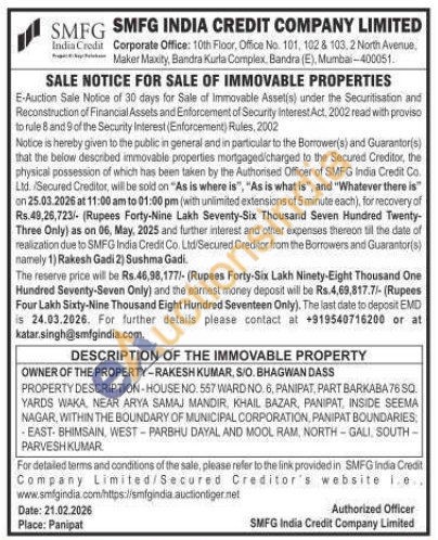 PROPERTY DESCRIPTION-HOUSE NO. 557 WARD NO. 6, PANIPAT, PART BARKABA 76 SQ. YARDS WAKA, NEAR ARYA SAMAJ MANDIR, KHAIL BAZAR, PANIPAT, INSIDE SEEMA NAGAR, WITHIN THE BOUNDARY OF MUNICIPAL CORPORATION, PANIPAT BOUNDARIES, -EAST-BHIMSAIN, WEST-PARBHU DAYAL AND MOOL RAM, NORTH-GALI SOUTH-PARVESH KUMAR