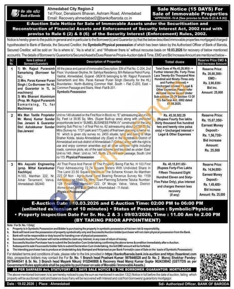 All the piece and parcel of immovable Description: EM of Flat No. C-204, 2nd Floor. Vrundavan Skyline, Nr. Sahitya Residency, B/h Reliance Petrol Pump, Vastral, Ahmedabad, Gujarat -382418 belonging to Mr. Rajput Puransinh Samartsinh and Mrs. Paras Kanwar Puran Singh (Security for the HL) Boundaries:- North-Building Common Wall, South Flat C-203, East-Common Passage and Stairs, West-Flat B-201. Symbolic Possession