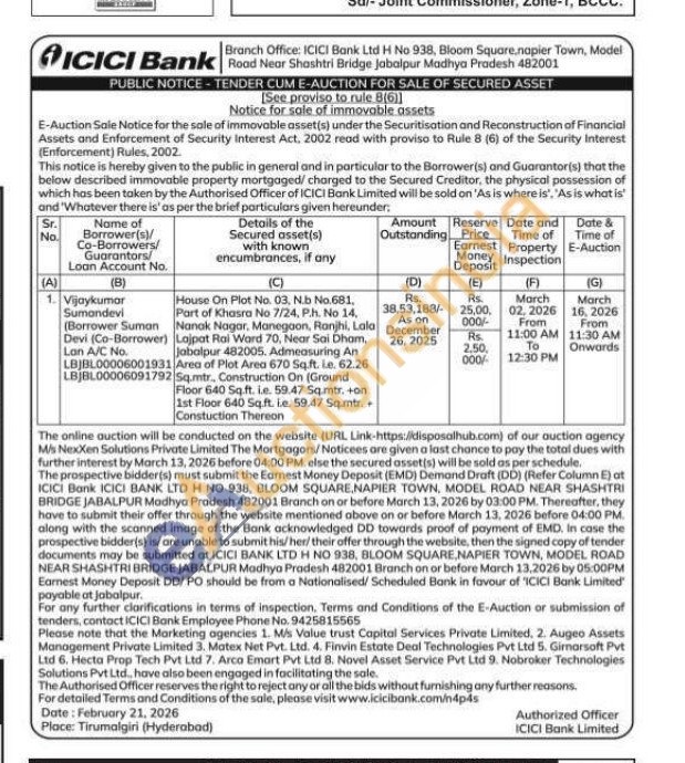 House On Plot No. 03, N.b No.681, Part of Khasra No 7/24, P.h. No 14, Nanak Nagar, Manegaon, Ranjhi, Lala Lajpat Rai Ward 70, Near Sai Dham, Jabalpur 482005. Admeasuring An Area of Plot Area 670 Sq.ft. le. 62.26 Sq.mtr., Construction On (Ground Floor 640 Sq.ft. i.e. 59.47 Sq.mtr. +on 1st Floor 640 Sq.ft. i.e. 59.47 Sq.mtr.+ Constuction Thereon