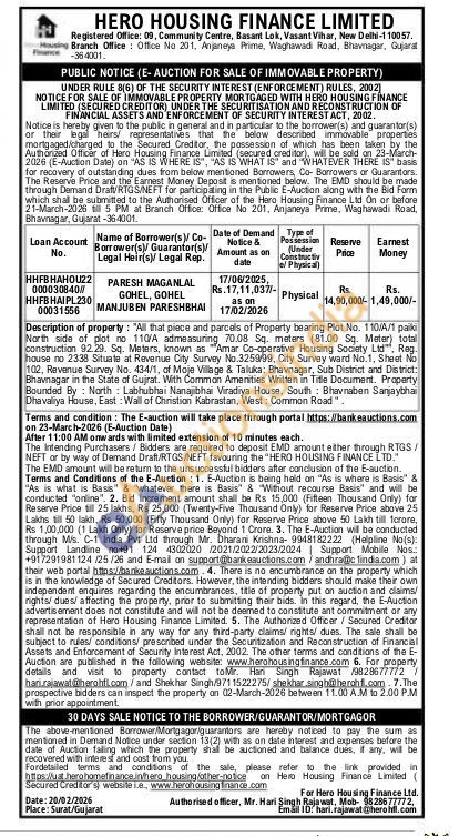 Description of property: "All that piece and parcels of Property bearing Plot No. 110/A/1 paiki Narth side of plot no 110/A admeasuring 70.08 Sq. meters (81.0 (81.00 Sq. Meter) total construction 92.29. Sq. Meters, known as "Amar Co-operative Housing Society Ltd, Reg. house no 2338 Situate at Revenue City Survey No.3259/99, City Survey ward No.1, Sheet No 102, Revenue Survey No. 434/1, of Moje Village & Taluka: Bhavnagar, Sub District and District: Bhavnagar