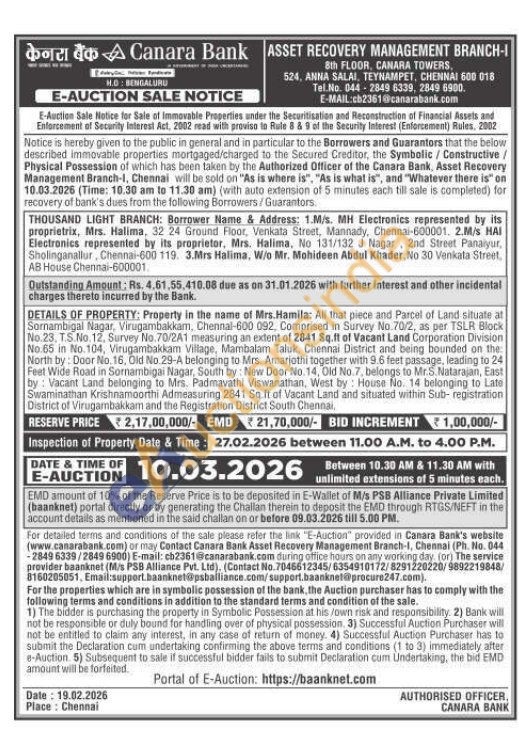 DETAILS OF PROPERTY: Property in the name of Mrs.Hamila: All that piece and Parcel of Land situate at Sornambigal Nagar, Virugambakkam, Chennal-600 092, Comprised in Survey No.70/2, as per TSLR Block No. 23. T.S.No. 12, Survey No.70/2A1 measuring an extent of 2841 Sq.ft of Vacant Land Corporation Division No.65 in No.104, Virugambakkam Village, Mambalam Taluk, Chennai District and being bounded on the North by: Door No. 16, Old No. 29-A belonging to Mrs. Amarjothi together with 9.6 feet passage, leading to 24 Feet Wide Road in Sornambigai Nagar, South by: New Door No. 14, Old No.7, belongs to Mr.S. Natarajan, East by: Vacant Land belonging to Mrs. Padmavathi Viswanathan, West by: House No. 14 belonging to Late Swaminathan Krishnamoorthi Admeasuring 2841 Sq.ft of Vacant Land and situated within Sub-registration District of Virugarnbakkam and the Registration District South Chennai