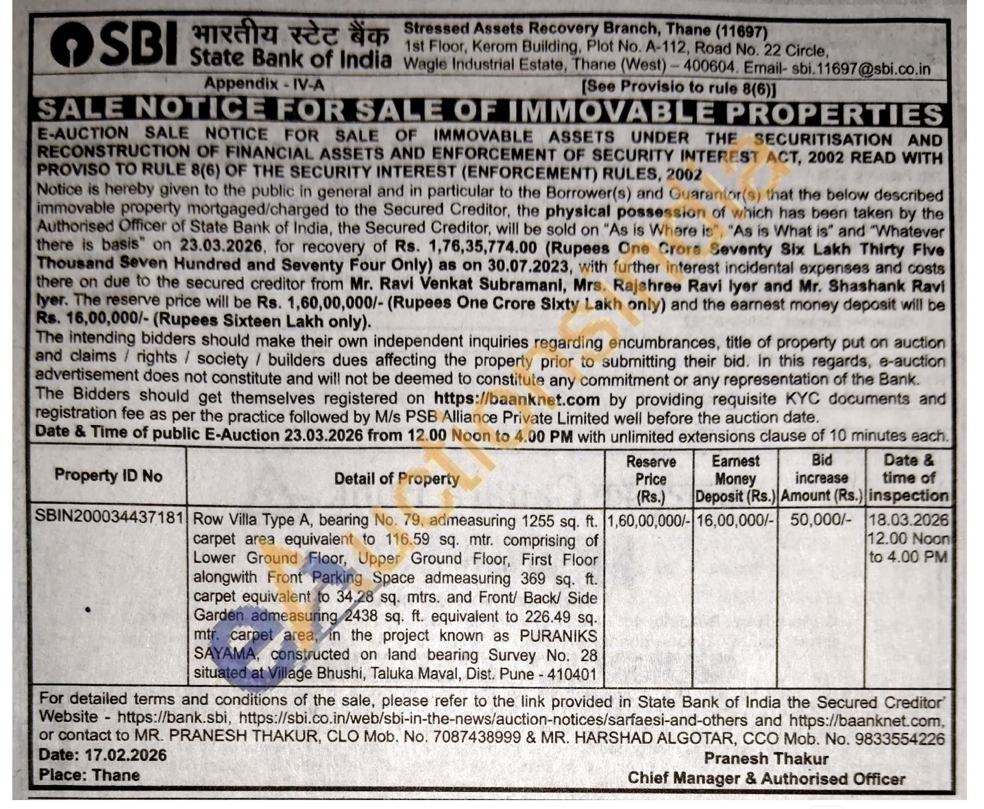 Row Villa Type A, bearing No. 79, admeasuring 1255 sq. ft. carpet area equivalent to 116.59 sq. mtr. comprising of Lower Ground Floor, Upper Ground Floor, First Floor alongwith Front Parking Space admeasuring 369 sq. ft. carpet equivalent to 34.28 sq. mtrs. and Front/ Back/ Side Garden admeasuring 2438 sq. ft. equivalent to 226.49 sq. mtr. carpet area, in the project known as PURANIKS SAYAMA, constructed on land bearing Survey No. 28 situated at Village Bhushi, Taluka Maval, Dist. Pune - 410401