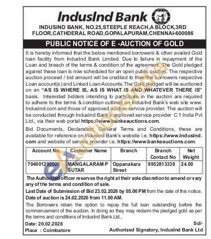 IndusInd Bank Gold Auctions Auction in Coimbatore