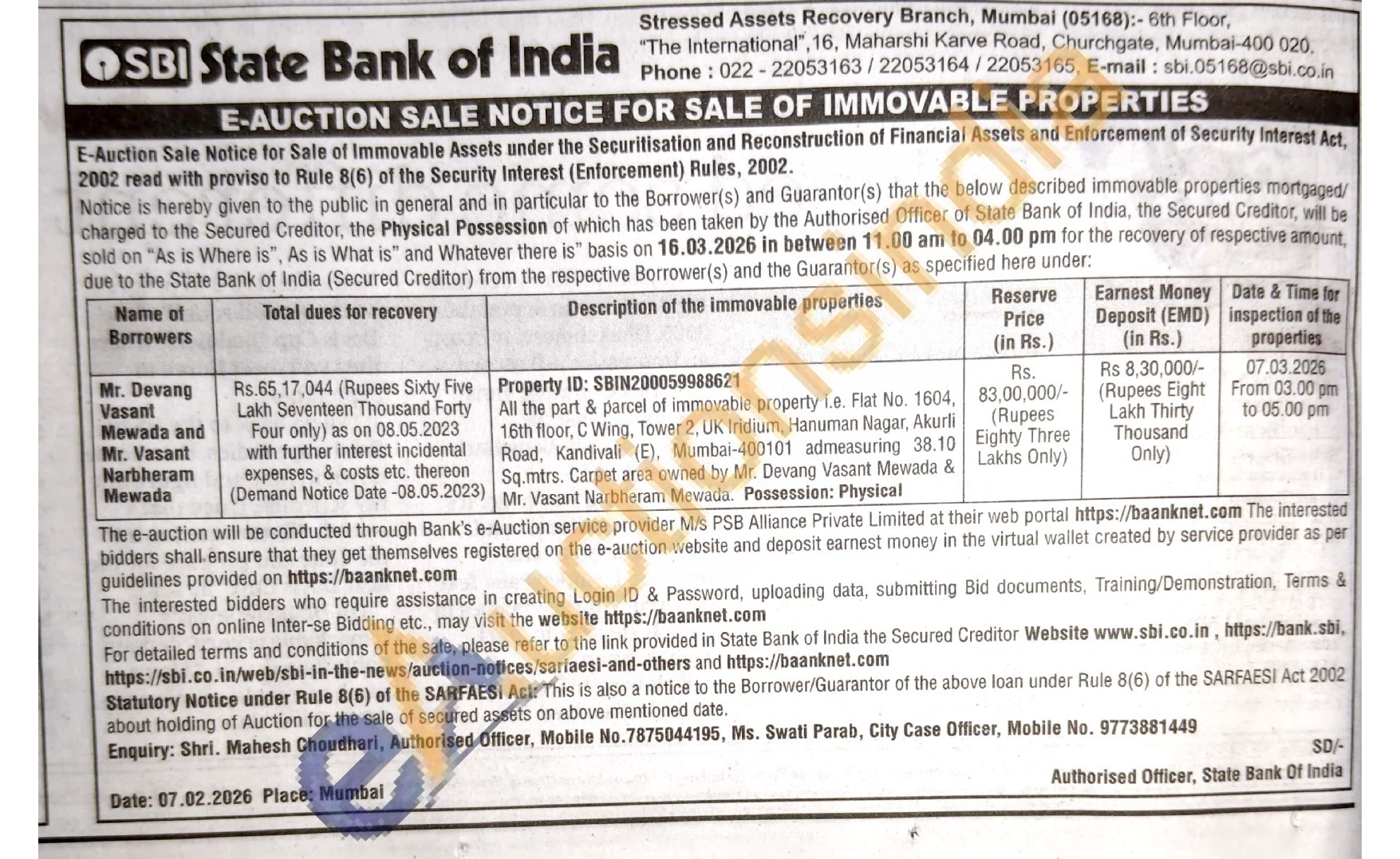 All the part & parcel of immovable property i.e. Flat No. 1604, 16th floor, C Wing, Tower 2, UK Iridium, Hanuman Nagar, Akurli Road, Kandivali (E), Mumbai-400101 admeasuring 38.10 Sq.mtrs. Carpet area owned by Mr. Devang Vasant Mewada & Mr. Vasant Narbheram Mewada. Possession: Physical