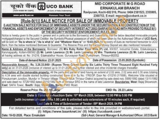 Description of the immovable property: All the parts and parcel of land having an extend of 2.02 ares, 2.02 ares and 0.30 ares totaling to 4.34 ares with double storied building constructed there in in Sy No. 1760/3P, Door No -31/216 (1/1898), Welcome Villa situated at Ponukunnam Junction, Mundur in Thrissur Village Thrissur Taluk Thrissur District acquired by sale deed nos 5995/1992 dated 13/11/1992 and sale deed no.: 5728/1992 dated 20/10/1992 both of Thrissur SRO in the name of late Lawrence. Boundaries: West: Bajaj Showroom, East: SAFA Tower, South: Bajaj Showroom, North: PWO Road