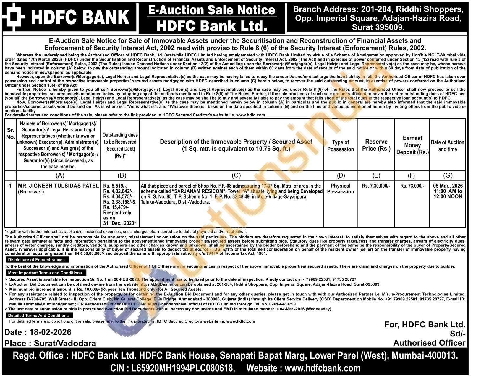 All that piece and parcel of Shop No. F.F.-08 admeasuring 17-37 Sq. Mtrs. of area in the scheme called "SARJANAM RESICOM", Tower "A" situate, lying and being Developed on R. S. No. 85, T. P. Scheme No. 1, F. P. No. 32,48,49, in Moje-Village-Sayajipura, Taluka-Vadodara, Dist.-Vadodara.