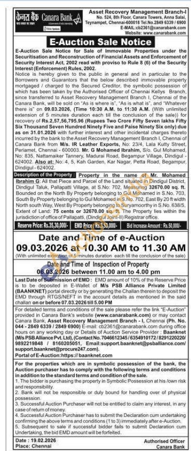 Property in the name of Mr. Mohamed Ibrahim G: All that Piece and Parcel of the Land situated in Dindigul District, Dindigul Taluk, Pallapatti Village, at S.No: 702, Measuring 32670.00 sq. ft. Bounded on the North By Property belonging to Gul Mohamed in S.No. 703, South By Property belonging to Gul Mohamed in S.No. 702, East By 20 ft width North south Way, West By Property belonging to Suryamoorthy in S.No. 638/5. Extent of Land: 75 cents or 32670.00 sq. ft. The Property lies within the jurisdiction of office of Pallapatti, (Dindigul Joint-II) Registrar office.