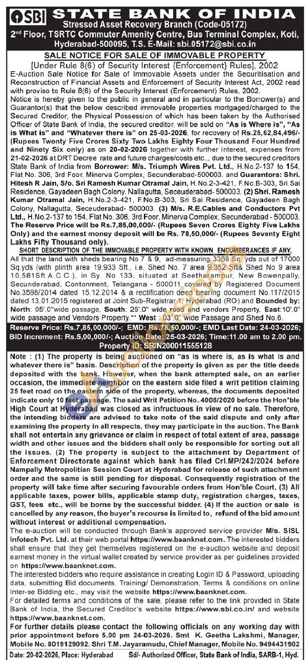 SHORT DESCRIPTION OF THE IMMOVABLE PROPERTY WITH KNOWN ENCUMBERANCES IF ANY, All that the land with sheds bearing No 7 & 9, ad-measuring 3368 Sq. yds out of 17000 Sq.yds (with plinth area 19.933 Sft., ie. Shed No. 7 area 9,352 Sft& Shed No 9 area 10,581Sft.A.C.C.), in Sy No 133, situated at Seetharampur, New Bowenpally, Secunderabad, Contonment, Telangana 500011 covered by Registered Document No.3598/2014 dated 15.12.2014 & a rectification deed bearing document No.117/2015 dated 13.01.2015 registered at Joint Sub-Registrar 1, Hyderabad (RO) and Bounded by: North: 05.0"wide passage, South: 25.0" wide road and vendors Property, East: 10.0" wide passage and Vendors Property. West: 03'.0" wide Passage and Shed No.6