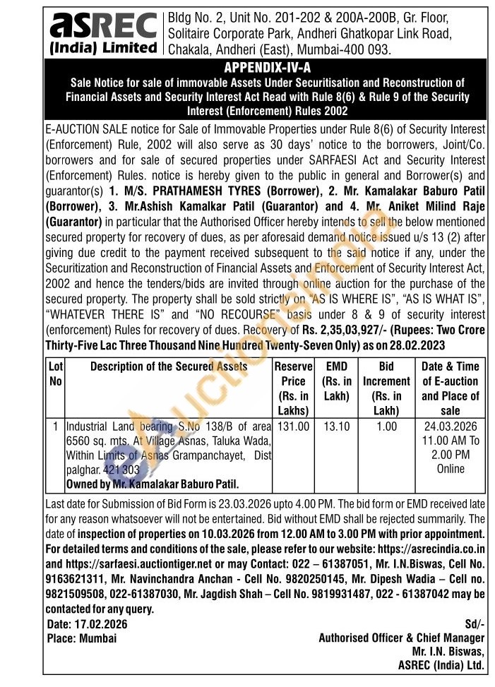Industrial Land bearing S.No 138/B of area 6560 sq. mts. At Village Asnas, Taluka Wada, Within Limits of Asnas Grampanchayet, Dist palghar. 421 303