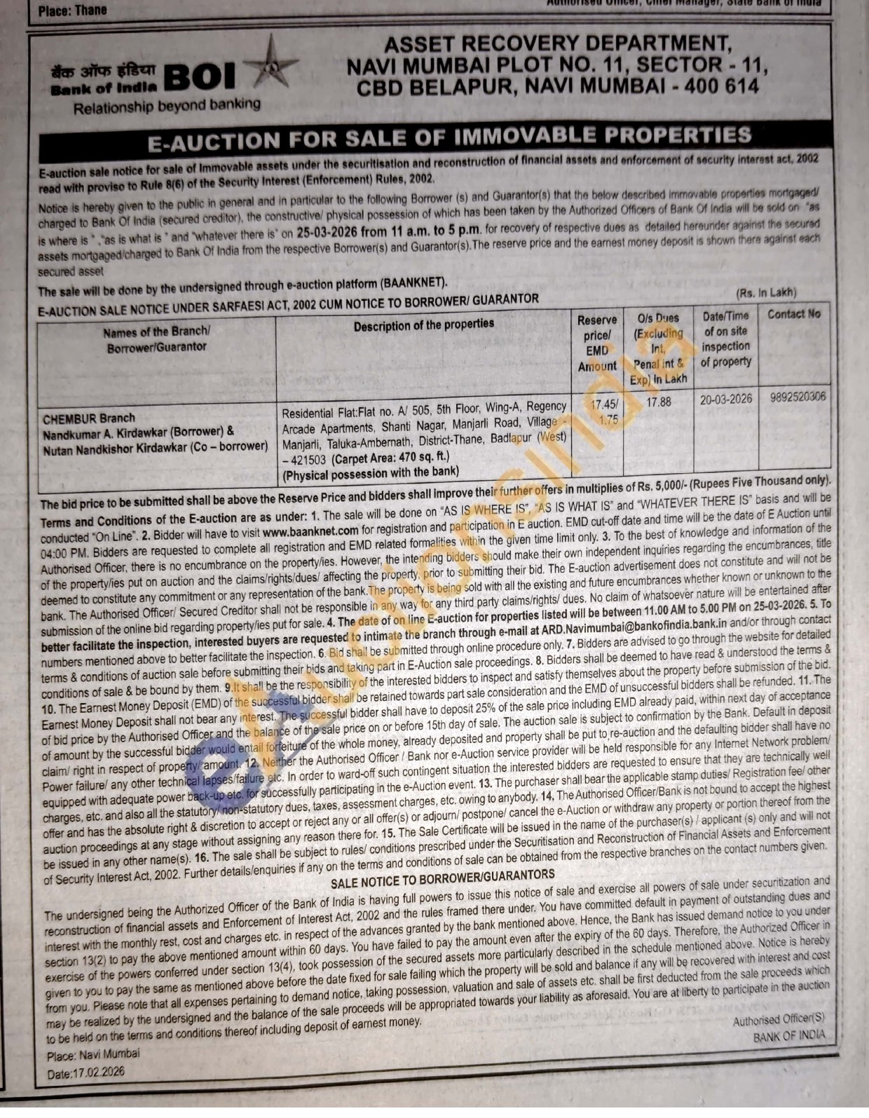 Residential Flat:Flat no. Al 505, 5th Floor, Wing-A, Regency Arcade Apartments, Shanti Nagar, Manjarli Road, Village-Manjarli, Taluka-Ambemath, District-Thane, Badlapur (West) -421503 (Carpet Area: 470 sq. ft.) (Physical possession with the bank)