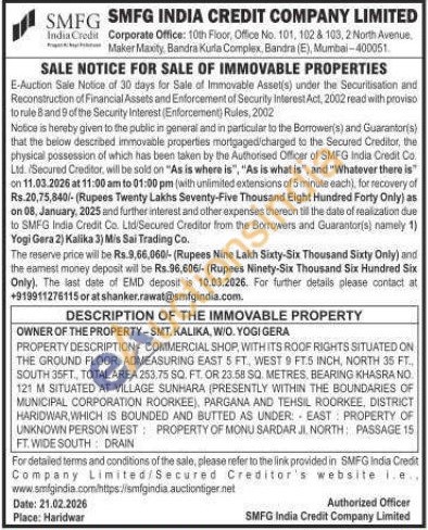 DESCRIPTION OF THE IMMOVABLE PROPERTY : OWNER OF THE PROPERTY-SMT. KALIKA, W/O. YOGI GERA : PROPERTY DESCRIPTION-COMMERCIAL SHOP, WITH ITS ROOF RIGHTS SITUATED ON THE GROUND FLOOR, ADMEASURING EAST 5 FT, WEST 9 FT.5 INCH, NORTH 35 FT. SOUTH 35FT, TOTAL AREA 253,75 SQ. FT. OR 23.58 SQ. METRES, BEARING KHASRA NO 121 M SITUATED AT VILLAGE SUNHARA (PRESENTLY WITHIN THE BOUNDARIES OF MUNICIPAL CORPORATION ROORKEE) PARGANA AND TEHSIL ROORKEE, DISTRICT HARIDWAR, WHICH IS BOUNDED AND BUTTED AS UNDER: EAST PROPERTY OF UNKNOWN PERSON WEST PROPERTY OF MONU SARDAR JI. NORTH: PASSAGE 15 FT.WIDE SOUTH DRAIN